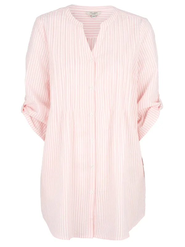 Blouse type: Klassieke blouse; Design: Gevoerde zoom/rand, Placket, Ronde zoom, Roll-up mouwen; Type sluiting: Knoopsluiting; Materiaal: Katoen; Motief: Gestreept; Kraag: Tuniek kraag; Details: Gedrapeerd; Extra's: Op staal naden; Pasvorm: Losse pasvorm; Armlengte: Lange mouw; Lengte: Lange pasvorm