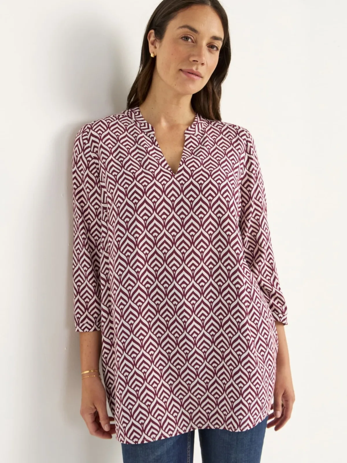 Design: Figuurnaden, Ronde zoom; Type sluiting: Slip; Materiaal: Viscose; Kraag: Tuniek kraag; Extra's: All-over patroon; Pasvorm: Losse pasvorm; Armlengte: Driekwart mouw; Lengte: Lange pasvorm