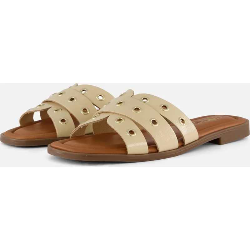Geef je zomerse look een elegante twist met deze beige Cellini slippers voor dames. De gekruiste banden met glanzende lakafwerking en subtiele goudkleurige details zorgen voor een verfijnde, vrouwelijke uitstraling die direct in het oog springt. De zachte binnenzool en platte zool maken dit model ideaal voor warme dagen waarop je er stijlvol én moeiteloos bij wilt lopen. Perfect te combineren met zowel een luchtige jurk als een casual outfit, waardoor deze slipper een veelzijdige must-have is voor je garderobe