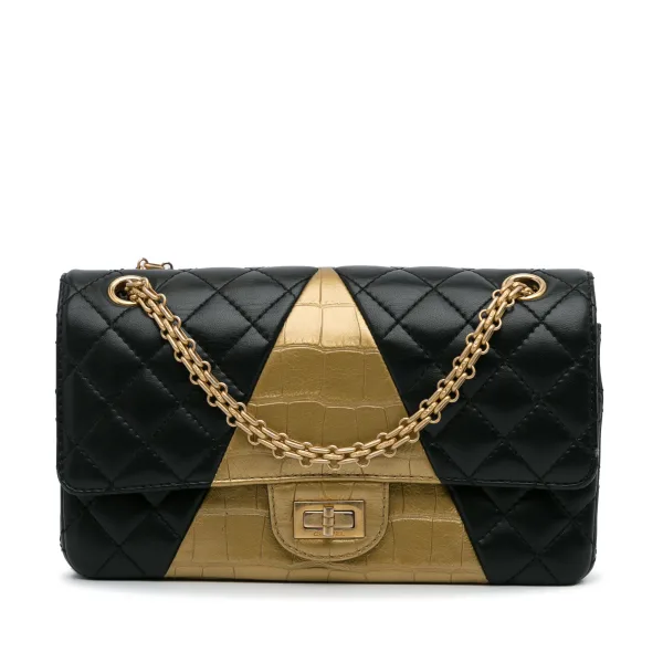 Ontdek iconische stijl, omarm tijdloze elegantie. Deze pre-owned Chanel 2.55 Reissue Double Flap Bag biedt een moderne twist op een klassiek ontwerp. Het bicolor geborduurde lamskin en het goudkleurig krokodil-embossed kalfsleer creëren een luxueuze uitstraling. Geniet van de veilige kettingriem met draaislot, waardoor je essentiële spullen veilig en georganiseerd blijven in de binnencompartimenten. Ervaar de duurzame kwaliteit en verfijning van Chanel en voeg een vleugje klasse toe aan elke outfit. Een pre-owned stuk met een verhaal om te vertellen, klaar voor zijn volgende hoofdstuk met jou. Afmetingen: 25 x 14,5 x 8,5 cm Conditiebeoordeling: AB Informatie over de conditie: Buitenkant Voorzijde Krassen. Buitenkanten Hoeken Verbleekt. Bovenkant Buitenkant Verbleekt. Binnenvoering Krassen. Binnenzak Krassen. Versiering Krassen.