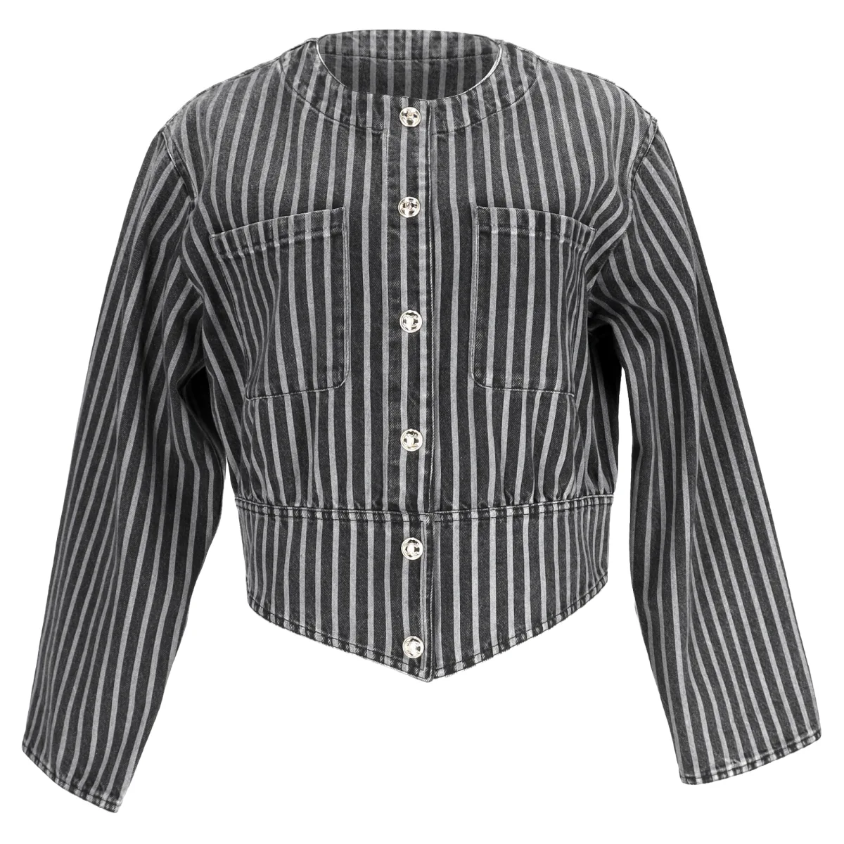 Chanel Gestreepte Button-Down Denim Jacket in Zwarte Katoen Prijzen