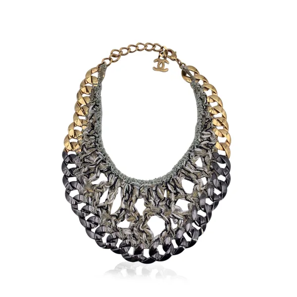 VINTAGE, RRP ALS NIEUW Prachtige Chanel ketting met bibi uit de Lente 2011 Collectie. Gunmetal en gouden metalen ketting met grijze tweed door de schakels geweven. Kreeftsluiting met CC-accent. Ondertekend 'CHANEL - B11 CC P - Made in Italy' ovale merkstempel op de sluiting. Lengte van de ketting: 18,5 inch - 47 cm. Staat Beoordeling: A - UITSTEKENDE Standsdetails: Licht gebruikt. Chanel doos inbegrepen. Bekijk de foto's aandachtig en vraag om detail. Doos?: ?: Ja Maten: lengte: 470 mm