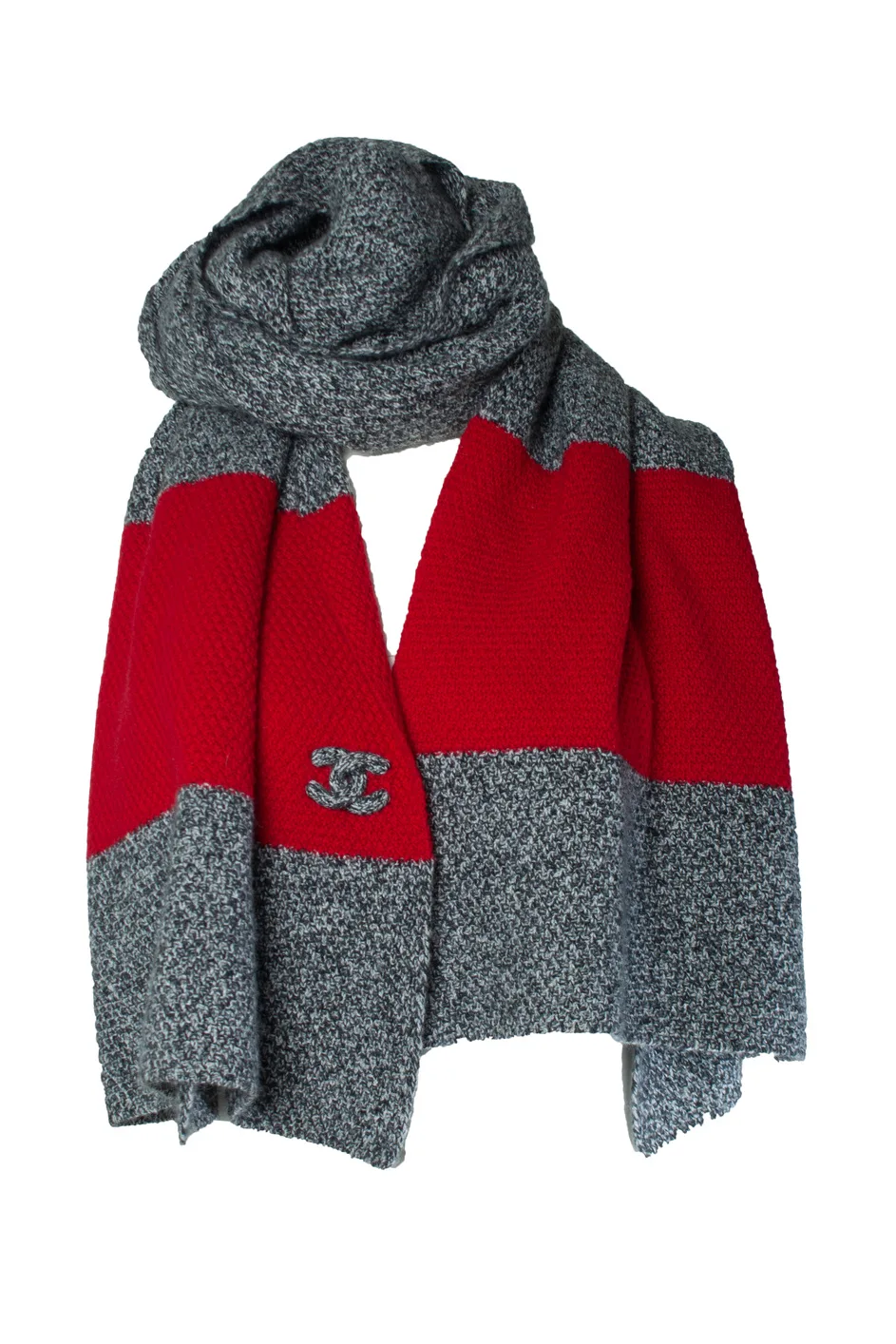 VINTAGE, RRP ALS NIEUW Chanel, oversized cashmere sjaal in grijs en rood met gebreide cc-logo. Het item is in zeer goede staat. STAND: zeer goede staat MAAT: one size AFMETINGEN: lengte 220 cm, breedte 45 cm MATERIAAL: 100% cashmere VERZORGING: chemisch reinigen KLEUR: grijs, rood PRODUCTLOCATIE: Nederland PRODUCTNUMMER: 8522 Afmetingen: breedte: 450 mm, lengte: 2200 mm