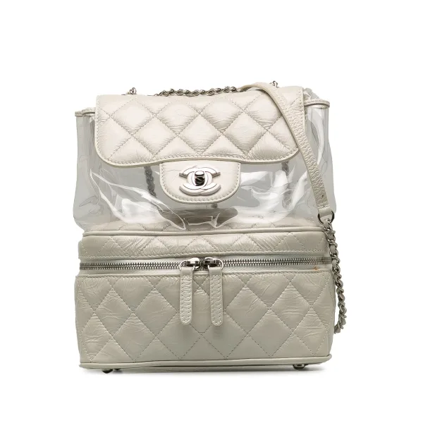 Ontketen je innerlijke trendsetter en laat je unieke stijl zien. Deze tweedehands Chanel rugzak, vervaardigd uit gequilt leer, tilt elke outfit naar een hoger niveau. Het onderscheidende bovencompartiment van helder PVC voegt een avant-garde toets toe. Geniet van veilige opslag met de dubbele ritssluiting. Het iconische Chanel-logo verklaart je onberispelijke smaak. De kettingriem zorgt voor comfortabel vervoer. Perfect voor het toevoegen van een vleugje luxe aan je dagelijkse avonturen of om een statement te maken op avondgelegenheden. Een duurzame en stijlvolle metgezel. Afmetingen: 23 x 21,5 x 11,5 cm Conditiebeoordeling: AB Conditie-informatie: Buitenste achterkant vervormd en versleten. Buitenste achterkant bevlekt met andere. Slot krasjes. Buitenste hoeken versleten. Versiering krasjes. Buitenste voorkant vervormd. Buitenste voorkant bevlekt met andere. Buitenste handgreep versleten. Buitenste handgreep bevlekt met andere. Binnenvoering verkleurd. Binnenvoering bevlekt met andere. Praktische bevestiging krasjes. Buitenste zijkant vervormd. Buitenste zijkant bevlekt met andere.