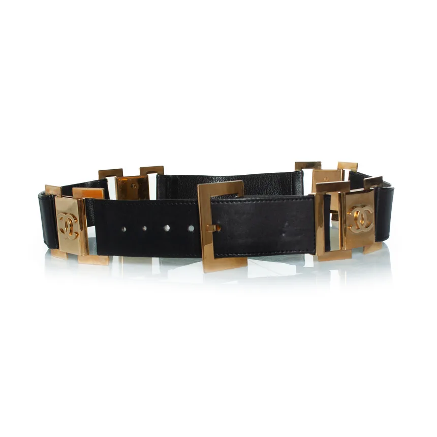 Aanbevolen verkoopprijs Vintage Chanel riem van zwart leer met goudkleurige metalen details en vier metalen plaatjes met het merklogo. Het item is in zeer goede vintage staat. Afmetingen: breedte: 45 mm, lengte: 960 mm.