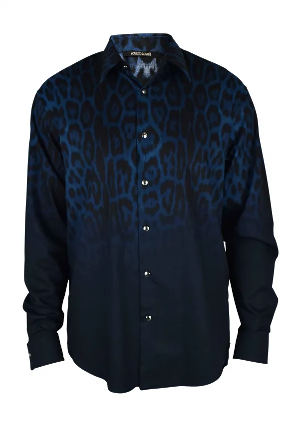 Roberto Cavalli blauw katoenen overhemd.Jaguar print met kleurverloop.Puntkraag.Lange mouwen met knoopsluiting bij de polsen.Knoopsluiting.Gemaakt in Italië.