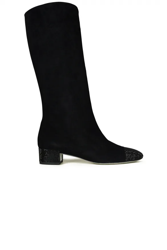 René Caovilla laarzen in zwart suède.Glinsterende hak van 4 cm hoog.Glitter neus en zool.Made in Italy.