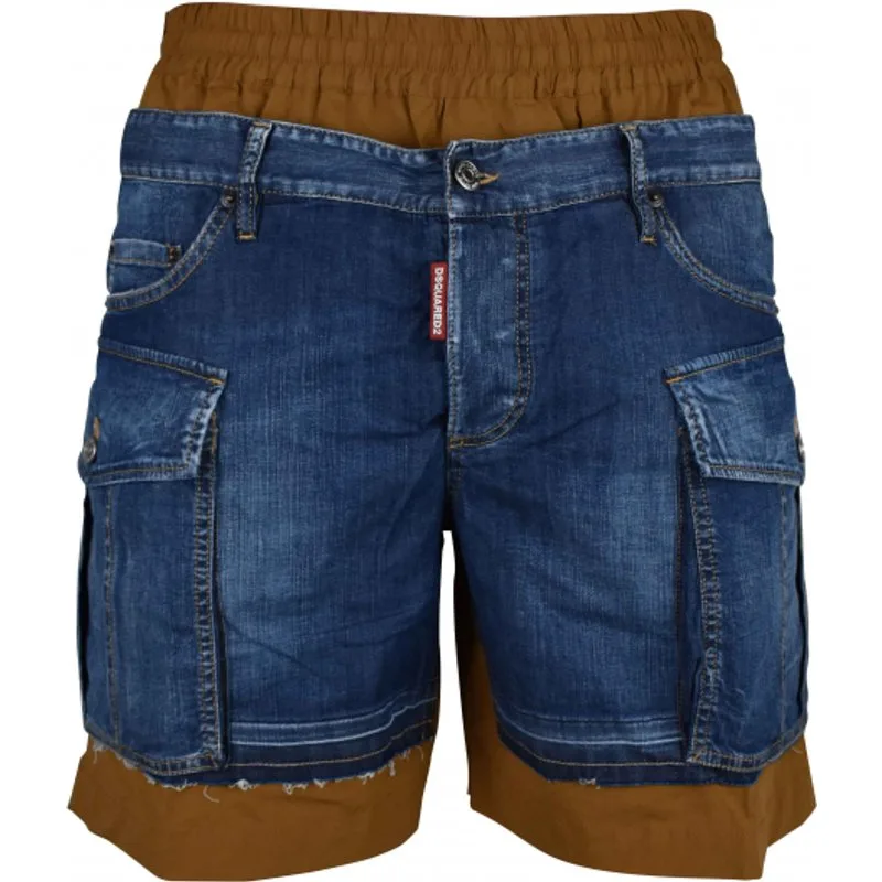 Denim- en stoffen short van Dsquared2.Plaat van bimateriaal. Over-de-schouder boxereffect.Denim voorkant. Rugkant van bruine stof.Zijzakken met cargo-effect.Denim achterzakken.Elastische tailleband.Rood logolabel op de gulp aan de voorkant.Knoopsluiting.Riemlussen.Gemaakt in Italië.