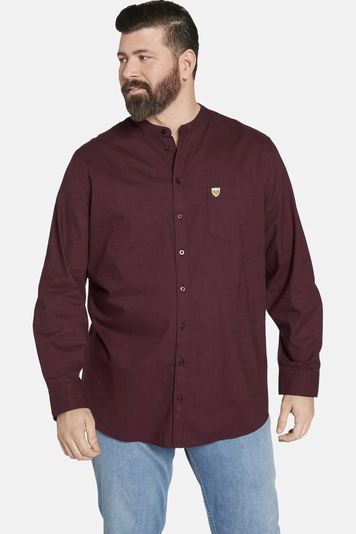 Charles Colby biedt Britse elegantie voor herenmode in grote maten.Bijzonder en minimalistisch: het overhemd DUKE TANCRED heeft een hoogwaardige linnenlook, een opstaande kraag en een onopvallend logoborduursel. Dit overhemd is de perfecte partner voor zoele zomeravonden. Het is luchtig en licht. De lange mouwen met mouwsplitten en knoop kunnen worden omgeslagen. Er zijn slechts twee gekleurde accenten: manchetten met een knoopsgat in contrastkleur en de tweede knoop van de knoopsluiting, die aangenaaid is met contrasterend garen. Een opgestikte borstzak en het comfortabele model met enigszins afgeronde zoom maken het overhemd compleet. 100% katoen. Geschikt voor de wasmachine