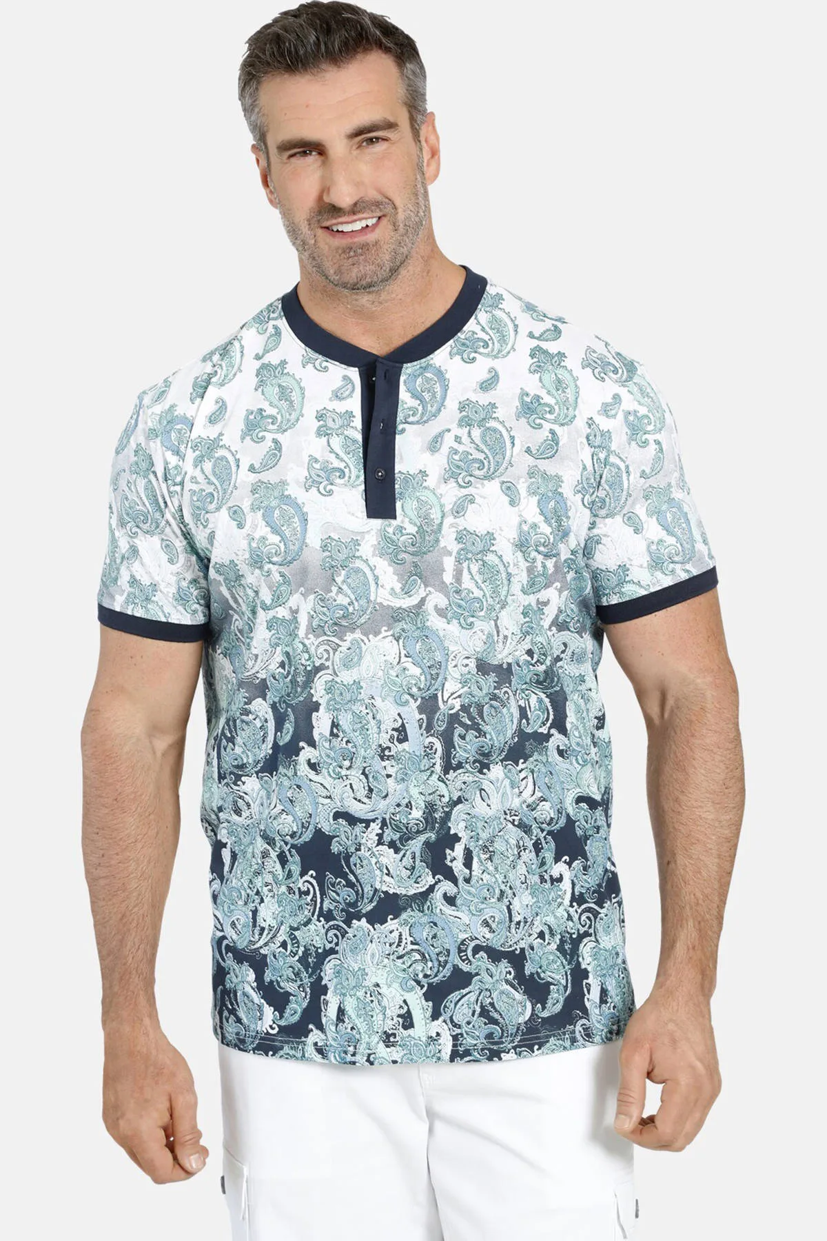 Charles Colby biedt Britse elegantie voor herenmode in grote maten.Paisley, het trendy motief met retrogevoel, maakt het T-shirt EARL COLLYNS het signature-shirt van het seizoen! Interessant is de uitvoering van de print all-over: hij heeft van boven naar beneden een kleurverloop van licht naar donker en biedt zo een moderne, urban interpretatie van het klassieke design. De contrasterende serafinohals geeft het shirt een geklede touch – zo laat een gentleman zich zomers graag zien in de city. Het shirt heeft de gebruikelijke, comfortabele snit. Comfort fit. 100% katoen. Geschikt voor de wasmachine.