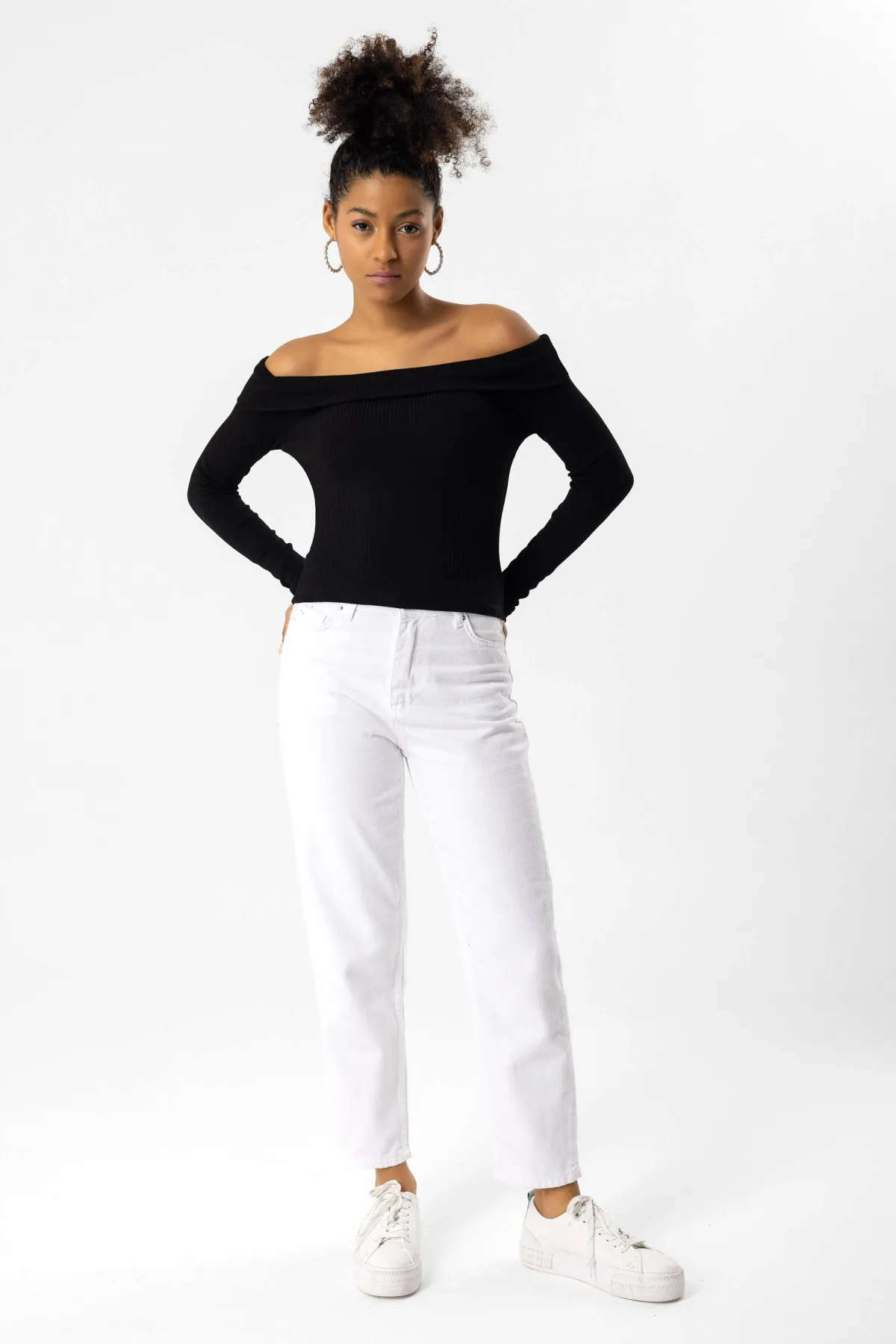Blouse type: Blouseshirt; Design: Strapless/off-shoulder; Materiaal: Jersey; Halstype: Carmen hals; Motief: Effen; Extra's: Met textuur; Pasvorm: Slanke pasvorm; Armlengte: Lange mouw; Lengte: Korte pasvorm
