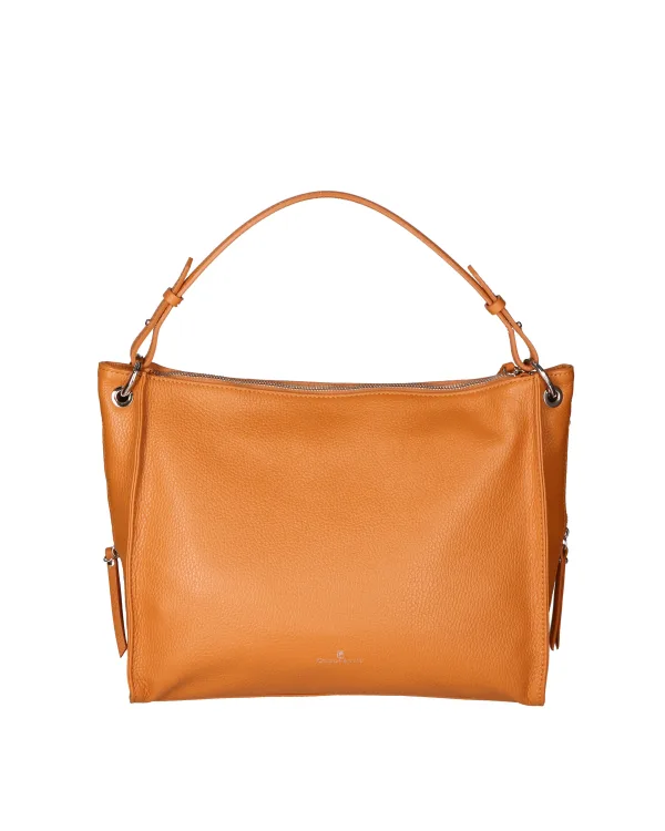 Dameshandtas met ritssluiting. twee rits- en twee open binnenzakken. een ritssluiting aan de achterkant en twee zijritsen met externe zakken. verstelbare en afneembare lederen schouderband. afneembaar leren handvat. twee binnenvakken. extern materiaal. gevoerd met 70% katoen - 30% polyester binnenkant. Afmetingen: 40x28x11 cm. Gemaakt in Italië