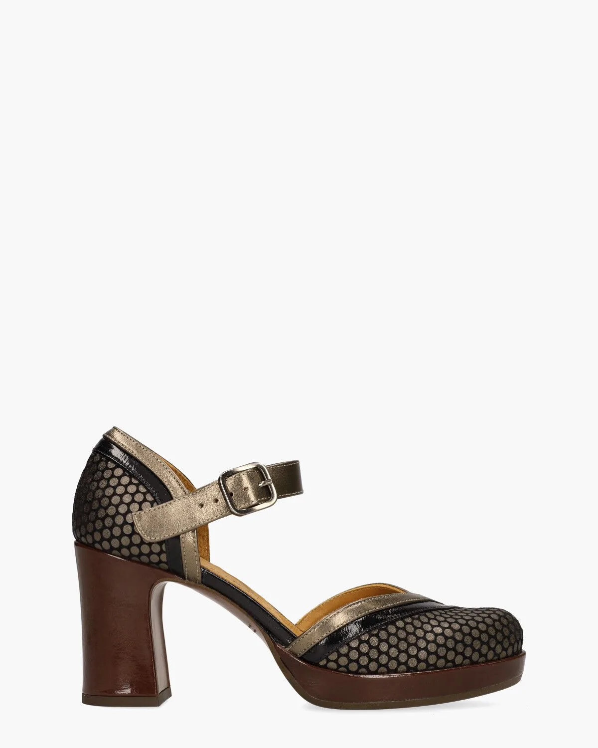 De Dagne pumps van Chie Mihara zijn allesbehalve alledaags. Een ontwerp vol contrast en karakter— retro, en verrassend verfijnd. De upper is opgebouwd uit zwart suède met metallic bronskleurige stippen, omlijst door zwart lakleer en metallic leren banden in bronstinten. Het bandje met gesp rond de enkel zorgt voor een stevige pasvorm,