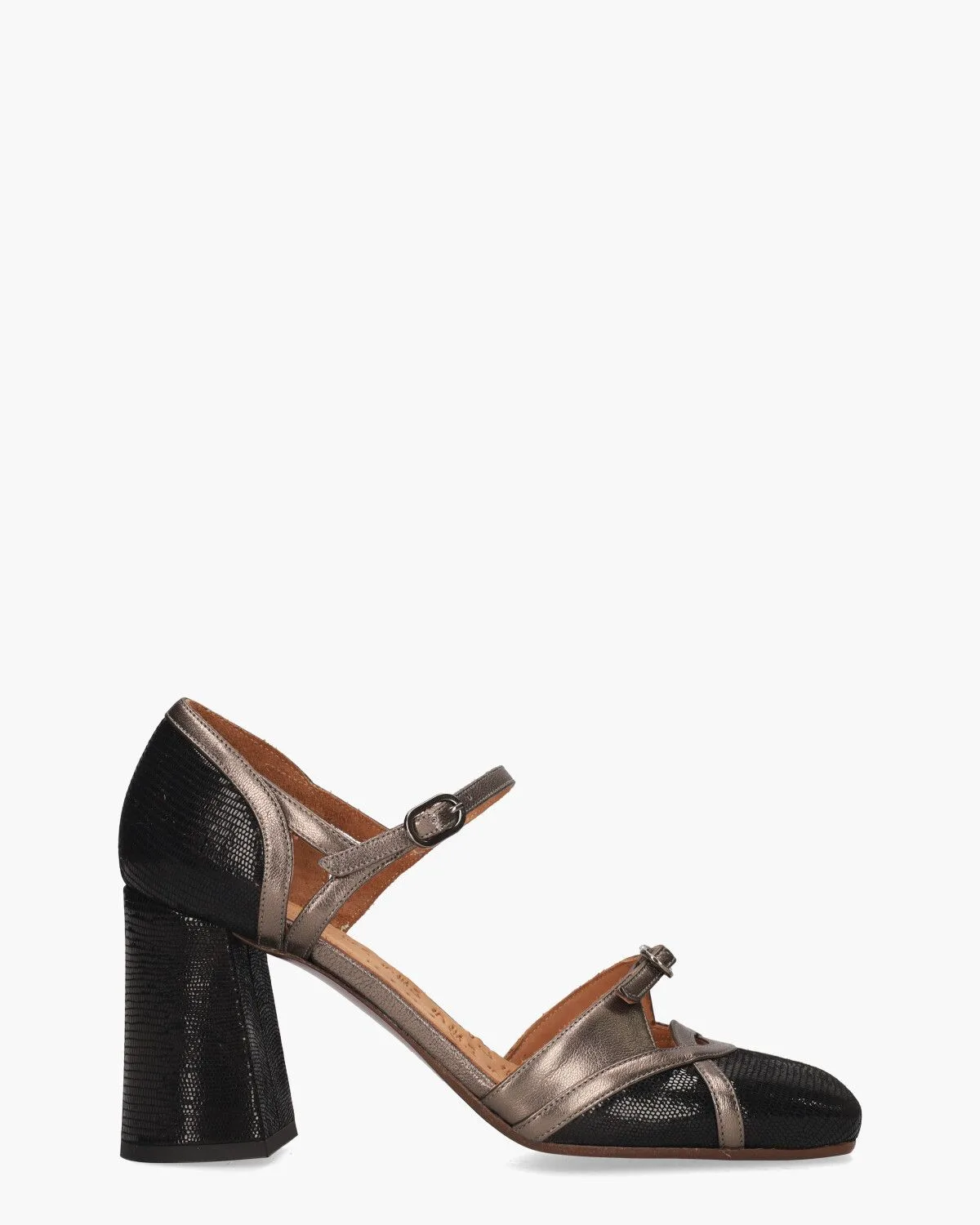 Pumps voor dames Obindi van het merk Chie Mihara. Dit carrémodel heeft een bovenzijde van zwart leer met een fijne animalprint, afgewerkt met bronskleurig glad leer. De binnenkant en het voetbed zijn van zacht leder gemaakt. Met de gespjes rond de enkel en op de wreef kun je de bandjes verstellen. De blokhak is circa 9 cm hoog. De onderzool