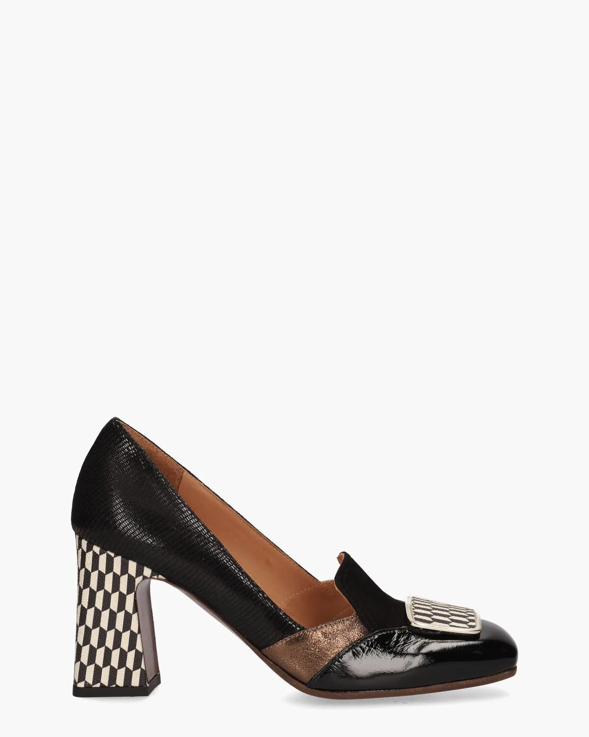 Loafers voor dames Ohico uit de collectie van Chie Mihara. Dit model heeft een upper van zwart glad en geprint leer en metallic bronskleurig leder. De stevige 8 cm hoge hak is van printleer met een zwart/off-white 3-D effect gemaakt. De binnenkant is in leer met een vast voetbed uitgevoerd. Het suède contrefort zorgt voor een fijne pasvorm.