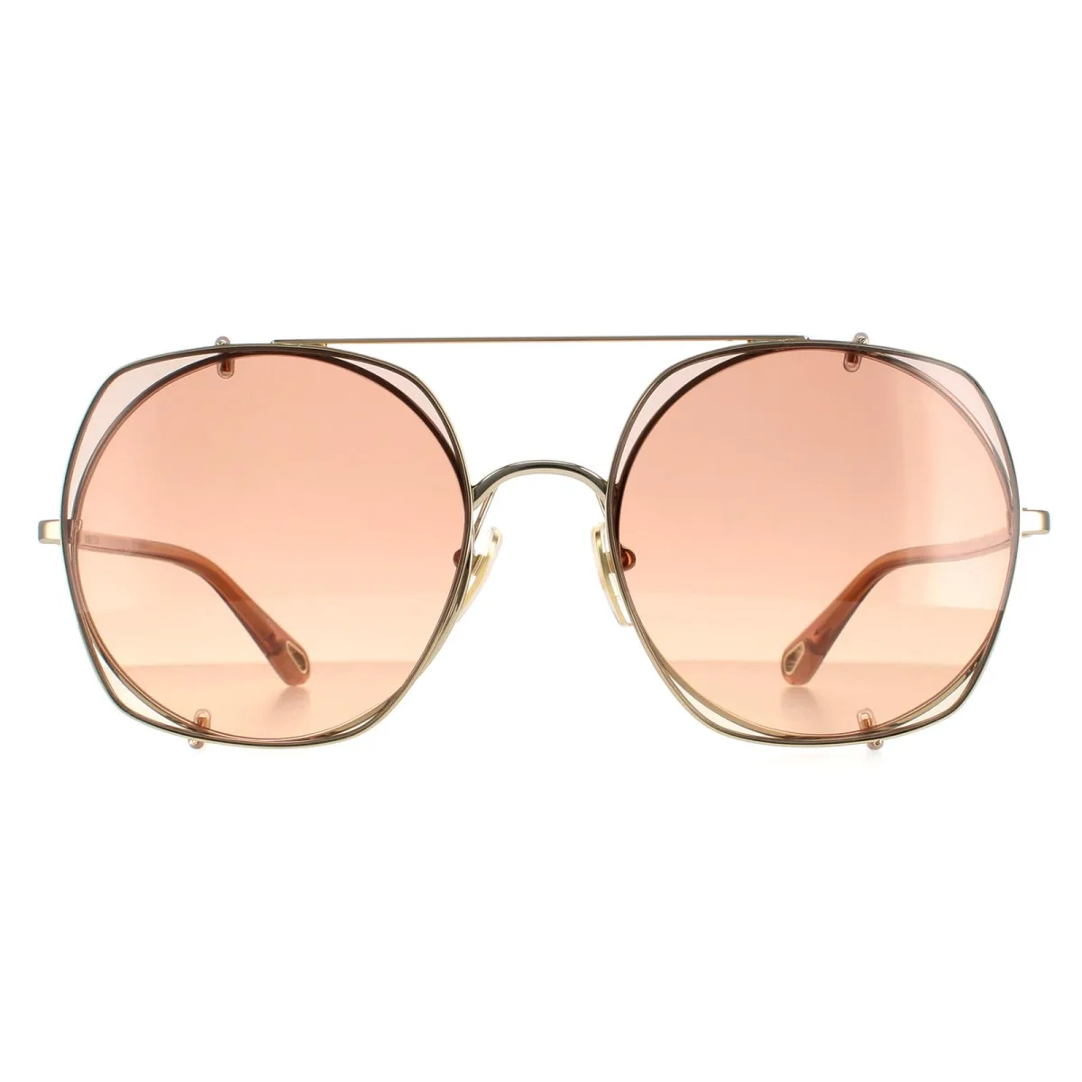 Chloe Aviator Womens Gold Brown Gradient Ch0042S Zonnebril zijn een chique ronde stijl met een sculpturale bekabeld frame, bovenste wenkbrauwbalk en tempels geëtst met het Chloe -logo voor authenticiteit.