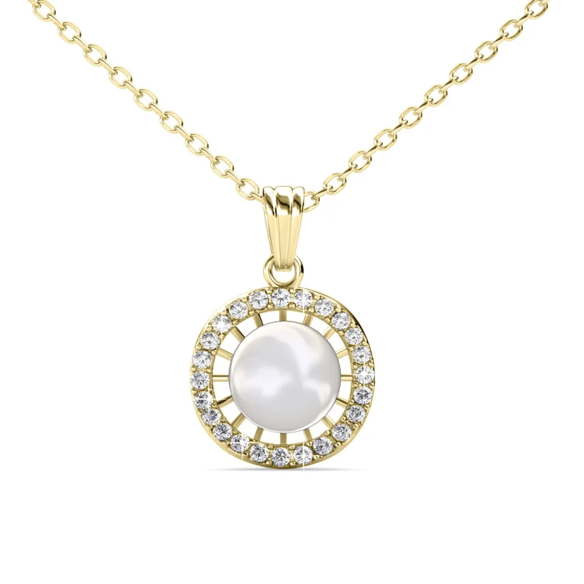Samenstelling: Messing Afwerking: 18k verguld Steensoort: Oostenrijkse parel en Oostenrijks kristal Aantal stenen (stuks): 24 Steenkleur: Kristal Kettinglengte (mm): 400 + 50