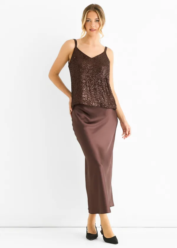 Upgrade je casual garderobe met onze Chocolade Pailletten V-Hals Cami Top! Deze comfortabele en stijlvolle top heeft een flatterende V-hals en opvallende pailletdetails. Perfect voor elke gelegenheid, deze top zorgt ervoor dat je opvalt en je zelfverzekerd voelt.