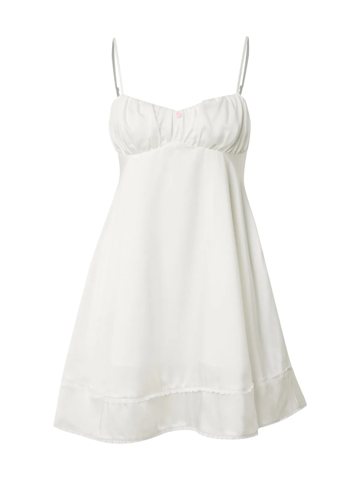 Design: Diepe snit/decolleté, Uitgesneden rug; Materiaal: Gerecycled materiaal; Motief: Effen; Soort bandjes: Spaghettibandjes; Details: Gedrapeerd; Extra's: Applicaties, Milieuvriendelijk geproduceerd; Lengte: Kort/mini; Snit: Uitlopend; Pasvorm: Slanke pasvorm; Armlengte: Mouwloos