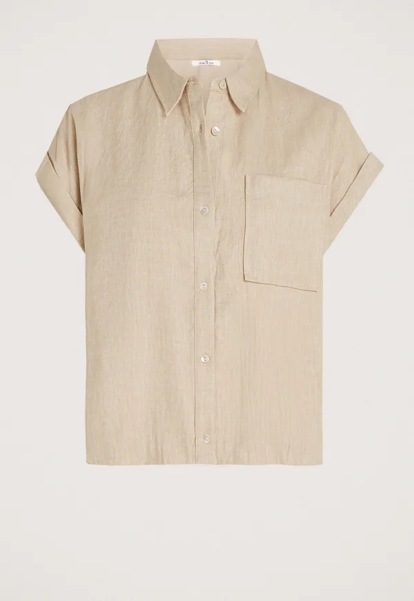 Dit is de S26_9 Kelly Blouse Safari Tan blouse van het merk Circle of Trust. Deze blouse is een luchtige keuze voor dagen waarop je comfortabel gekleed wilt zijn zonder in te leveren op uitstraling. De mix van linnen en katoen voelt aangenaam en ademend aan, wat het model prettig maakt voor warmer weer. Dankzij de loose fit valt de blouse soepel, terwijl de korte mouwen bijdragen aan een ontspannen look. De knoopsluiting en borstzak geven het ontwerp een praktische en verzorgde afwerking. Ook de elastische band voegt extra draaggemak toe.