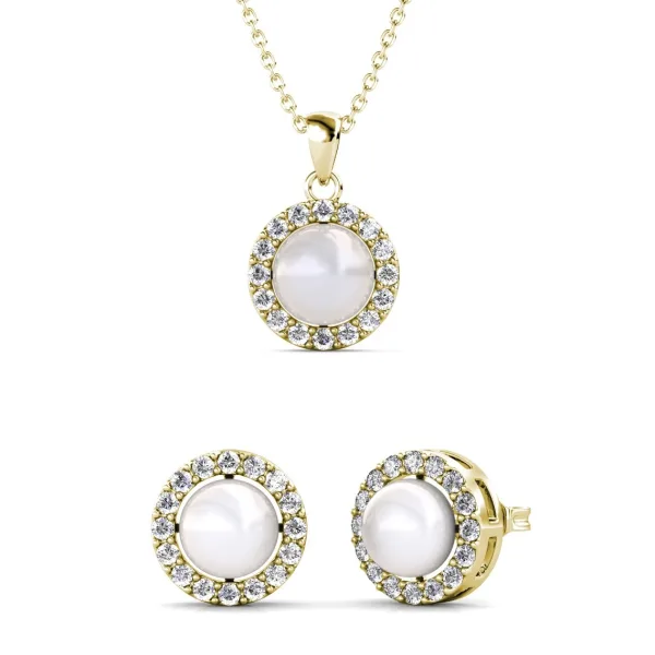 Samenstelling: Messing Afwerking: 18k verguld Steensoort: Oostenrijks kristal en imitatieparel Aantal stenen (stuks): 48 Steenkleur: Kristal Diameter oorbellen (mm): 9,6 Lengte ketting (mm): 400 + 50