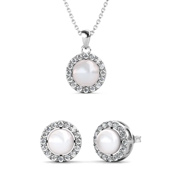 Samenstelling: Messing Afwerking: Rhodium geplateerd Soort steen: Oostenrijks kristal en imitatieparel Aantal stenen (st.): 48 Kleur steen: Kristal Diameter oorbellen (mm): 9,6 Lengte ketting (mm): 400 + 50
