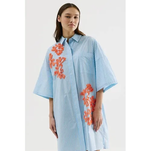 Lichtblauw, vrouwelijk en makkelijk te stylen, deze lichtblauwe katoenen blousejurk van CKS is geschikt voor lentedagen. De jurk heeft een korte lengte en combineert een klassieke kraag met een bloemenprint in lichtblauw en oranje. Door de driekwart mouwen en rechte pasvorm voelt de jurk luchtig aan, ideaal als het buiten wat warmer wordt.Details die het verschil maken Gemaakt van 100% katoen, voelt zacht en comfortabel aan op de huid Korte mini jurk met blousemodel, geschikt voor een casual of nette look Lichtblauwe basis met oranje bloemenprint voor een frisse, lenteachtige uitstraling Driekwart rechte mouwen voor een ontspannen, maar verzorgde look Klassieke kraag en volledige knoopsluiting aan de voorkant Handige zijzakken, bijna onzichtbaar weggewerkt in de zijnaden Wasbaar op 30 graden en lauw strijkbaar (1 punt) Niet drogen in de droogtrommel voor het mooiste behoud van de stofVoor lichte lentedagenDeze korte blousejurk uit de lentecollectie draag je makkelijk met sneakers voor een relaxte dag, of met sandalen als je net iets gekleder wilt gaan. De soepele katoenen stof maakt de jurk geschikt voor dagelijks gebruik, van werk tot een dagje stad.CKS: speelse mode met een verzorgd gevoelCKS staat bekend om kleding met kleur, prints en doordachte details. De collecties combineren een frisse, eigentijdse stijl met draagbare modellen die goed in het dagelijkse leven passen. Met deze jurk voeg je een kleurig maar toch makkelijk te combineren item toe aan je garderobe.Deze jurk pak je er snel bij zodra de eerste zon zich laat zien.