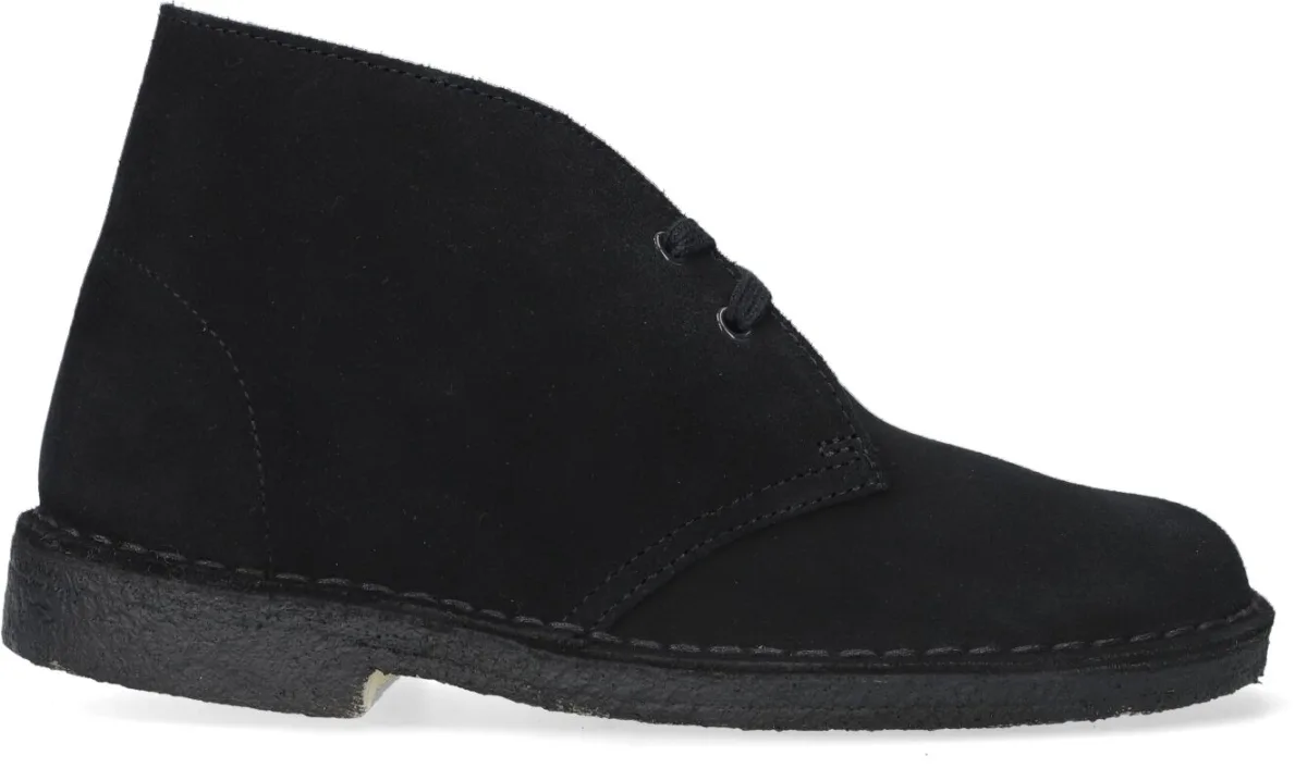 De DESERT BOOT DAMES veterschoen van het merk CLARKS ORIGINALS is al sinds de jaren '50 een klassieker en heeft nog steeds een ijzersterk silhouet door de eenvoudige lijnen en de bekende crêpe zool. Dit zwarte onovertroffen model heeft een comfortabele pasvorm en is uitgevoerd in zacht suède. De schoen is gevoerd met leer en heeft een vast voetbed. Het getextureerde profiel in de flexibele rubberen crêpe zool heeft de kenmerkende look en biedt grip bij ieder avontuur. De schachthoogte is 10 cm, gemeten bij maat 37. Maatadvies: dit model valt smal, wij adviseren een maatje groter te bestellen.