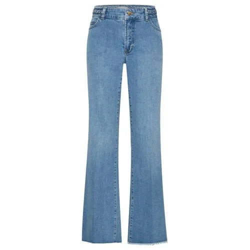 Deze flared jeans voor dames van CLAUDIA BY CLAUDIA STRÄTER is uitgevoerd in medium blue denim en past bij veel verschillende outfits. De lange pijpen met subtiele uitlopende zoom zorgen voor een flared model, terwijl de regular waist netjes in de taille valt. De klassieke 5-pocketstijl krijgt een extra detail door een gevlochten inzet, waardoor de jeans net even anders is dan een standaard model.Verfijnde details in denim Kleur in medium blue denim voor een rustige, makkelijk te combineren basis Flared pijp die vanaf de knie uitloopt voor een uitlopende lijn Regular waist die aansluit rond de taille Gemaakt van 98% katoen en 2% elastaan voor een zachte stof met lichte stretch 5-pocketmodel met rits- en knoopsluiting Gevlochten detail als subtiel accent Lange lengte, te dragen met sneakers, sandalen of hakkenGemakkelijk te combineren in je dagelijkse outfitsDeze flared jeans laat zich op verschillende manieren dragen. In combinatie met een eenvoudig T-shirt of top ontstaat een casual set voor overdag. Met een blouse of blazer krijgt dezelfde jeans een meer verzorgde uitstraling. De medium blauwe wassing blijft rustig, waardoor andere items in je outfit goed uitkomen.Stijlgevoel van Claudia SträterClaudia Sträter ontwerpt kleding met aandacht voor pasvorm en detail. De lijn CLAUDIA BY CLAUDIA STRÄTER sluit daarop aan met moderne items die onderling en met andere stukken te combineren zijn. Zo voeg je met deze jeans een basisstuk toe dat goed aansluit bij een garderobe met verschillende stijlen.Een flared jeans die je gemakkelijk inzet voor zowel vrije tijd als meer geklede momenten.