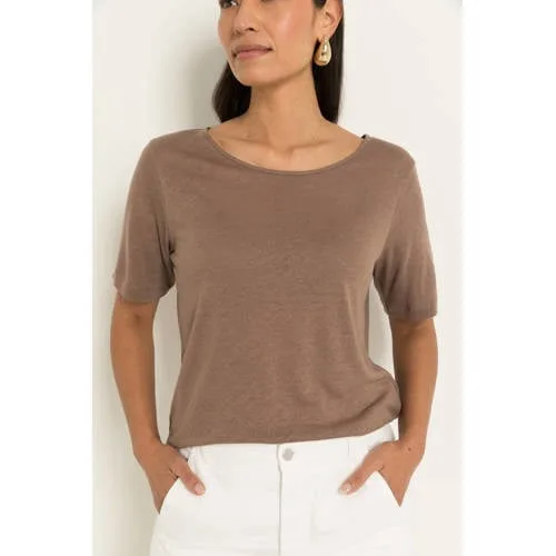 Deze top van Claudia Sträter is een rustige basic met subtiele flair. De bruine dames top met linnen en lyocell heeft een elegante uitstraling door de zachte kleur en tijdloze pasvorm. Geschikt voor lentedagen waarop je er verzorgd uit wilt zien met weinig moeite. De combinatie van 70% lyocell en 30% linnen zorgt voor een luchtig en soepel gevoel op de huid.Zachte stof en doordachte details Gemaakt van 70% lyocell en 30% linnen, voelt licht en comfortabel aan Bruine effen kleur, makkelijk te combineren met andere items in je garderobe Driekwart mouwen met rechte inzet voor een rustige, moderne look Ronde hals die mooi langs de halslijn valt zonder te diep te zijn Geen zakken of opvallende details, waardoor de pasvorm centraal staat Past goed binnen een feminine stijl en is geschikt voor het lenteseizoenVeelzijdig voor werk en vrije tijdDe top laat zich eenvoudig stylen. Combineer met een hoge pantalon voor een nette werkoutfit of draag de top met een lichte jeans voor een ontspannen weekendlook. De driekwart mouw maakt het een praktisch item voor dagen waarop het nog net iets frisser is.De signatuur van Claudia SträterClaudia Sträter staat bekend om ontwerpen met een heldere lijnvoering en aandacht voor detail. De CLAUDIA BY CLAUDIA STRÄTER collectie sluit hier naadloos op aan, met moderne items die onderling goed te combineren zijn en je garderobe langdurig versterken.Een tijdloze basic die je het hele seizoen door blijft dragen.