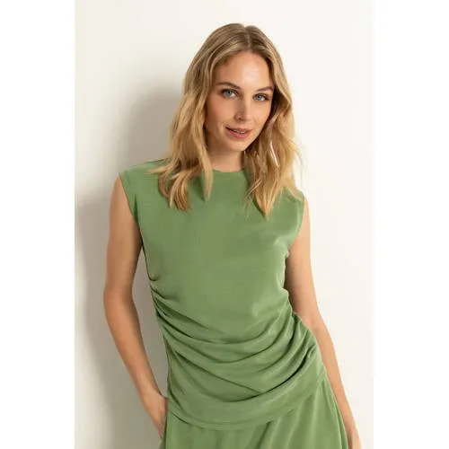 Deze donkergroene modal top met kapmouw van CLAUDIA BY CLAUDIA STRÄTER is een rustige basic met verfijnde details. De kleur 'Willow' is een diepe groentint die zacht oogt en makkelijk combineert met zowel lichte als donkere onderstukken. De top heeft een ronde hals en elegante kapmouwen, waardoor je schouders subtiel geaccentueerd worden. De soepele stof met modal voelt zacht aan op de huid en valt mooi om het lichaam.Verzorgde details in een eenvoudige vorm Korte kapmouwen geven een vrouwelijke en luchtige uitstraling Ronde hals die netjes aansluit zonder te hoog te zitten Effen donker groene kleur 'Willow' voor een rustige, tijdloze look Plooidetails aan de voorkant zorgen voor een verfijnd silhouet Gemaakt van een zachte, soepel vallende stof met modal Geen sluiting, je trekt de top eenvoudig over het hoofd aan Geschikt voor standaardmaten en onderdeel van de Feminine collectieVeelzijdig voor werk en vrije tijdDeze top past goed in een voorjaarsgarderobe. Combineer met een nette broek of kokerrok voor een verzorgde werklook, of draag de top met een jeans en sneakers voor een ontspannen dag. De effen kleur maakt het eenvoudig om er een blazer, vest of statement ketting bij te dragen.Claudia Sträter: moderne vrouwelijkheidClaudia Sträter staat bekend om vrouwelijke collecties met aandacht voor pasvorm en detail. De lijn CLAUDIA BY CLAUDIA STRÄTER sluit aan bij een moderne, verzorgde stijl die goed past in het dagelijks leven. Zo haal je een doordacht ontworpen top in huis waar je lang plezier van hebt.Een rustige basis met een vrouwelijke twist, ideaal als betrouwbare favoriet in je kledingkast.