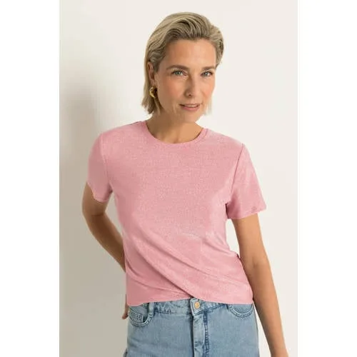 Breng subtiele glamour in je garderobe met deze Claudia Sträter top knitted in zachte roze tint. De fijngebreide top heeft een vrouwelijke ronde hals en korte, rechte mouwen. Door de glinsterende lurex draad krijgt de effen kleur een sprankelend effect dat mooi met het licht speelt. Ideaal voor momenten waarop je net iets meer uitstraling wilt, zonder dat het te opvallend wordt.Fijn breisel met subtiele glans Zachte knit met ingewerkte glitters en lurex voor een verfijnde glans Roze effen kleur die makkelijk te combineren is met broeken en rokken Korte, rechte mouwen die luchtig aanvoelen op de huid Ronde hals die mooi aansluit langs de halslijn Zonder sluiting, waardoor je de top eenvoudig aantrekt Soepel materiaal met elastaan dat licht meerekt voor een prettig draaggevoelVan dag naar avondDeze knitted top past goed bij een zakelijke kantoorlook met een nette broek, maar doet het ook goed in een meer ontspannen setting. Combineer met een jeans en sneakers voor overdag of met een elegante rok en hakken voor een diner. De glanzende draad zorgt steeds voor een verzorgde uitstraling.Stijlvolle signatuur van Claudia SträterClaudia Sträter staat bekend om tijdloze, vrouwelijke ontwerpen met een moderne twist. Binnen de CLAUDIA BY CLAUDIA STRÄTER lijn komen draagbaarheid en stijlvol design samen in items die je makkelijk in je bestaande garderobe opneemt.Een roze knit die je het hele seizoen door blijft pakken voor een verzorgde, vrouwelijke look.