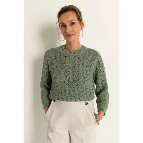 Deze grof gebreide Claudia Sträter trui is een basic met een subtiel speels accent. De effen groene kleur geeft je outfit direct een frisse, moderne uitstraling. Door de iets langere lengte valt de trui over de heup en combineer je de trui gemakkelijk met een strakke broek of rok. De ronde hals en rechte mouwen zorgen voor een rustige, cleane look die je zo vanuit je werk doortrekt naar een etentje of een dagje stad.Grof breisel met subtiele glans Gemaakt van zacht katoen met een klein percentage metallic garen voor een lichte glans Grof gebreide structuur voor een comfortabele, rustige uitstraling Lange mouwen en langere lengte voor extra bedekking en een gestroomlijnd silhouet Ronde hals die aansluit zonder te hoog in de hals te zitten Effen groene kleur die te combineren is met denim, wit en neutrale tinten Zonder sluiting, zodat je de trui eenvoudig aantrekt en het model gelijk goed valtIdeaal voor het tussenseizoenDeze pullover is geschikt voor lentedagen waarop je net wat extra warmte wilt, maar geen zware laag. Het grovere breisel voelt aangenaam aan op de huid en het rechte model geeft bewegingsruimte, of je nu thuis werkt, onderweg bent of een dag op stap gaat.De signatuur van Claudia SträterClaudia Sträter staat bekend om vrouwelijke, doordachte designs met een tijdloze uitstraling. De collecties worden ontworpen met oog voor detail, pasvorm en draagmoment, zodat je items langdurig op verschillende manieren kunt combineren.Een pullover die je garderobe rustig houdt en toch net dat beetje extra geeft door de structuur en subtiele glans.