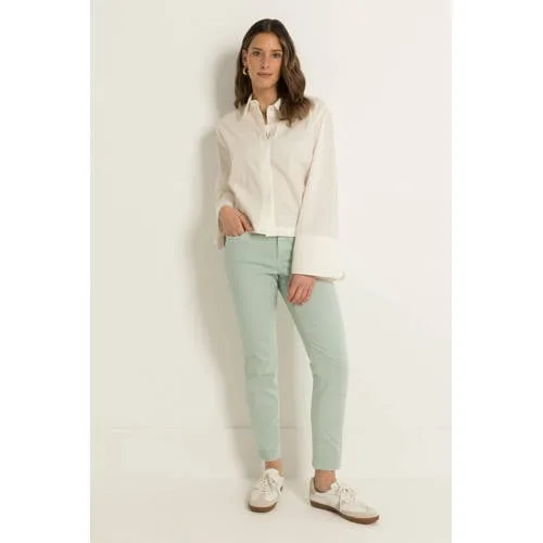 Deze grijsgroene slim fit jeans voor dames is een praktische basis voor elke dag. De broek heeft een slanke pasvorm langs het been en een regular waist, waardoor de tailleband aansluit zonder te knellen. De effen grijsgroene kleur is een alternatief voor klassiek blauw denim en combineert goed met zowel lichte als donkere bovenstukken.Details die je elke dag draagt Gemaakt van 48% katoen, 24% viscose en 2% elastaan voor een zachte touch en soepele stretch Slim fit model met lang been voor een smal silhouet Regular waist die op de heupen valt Klassieke 5-pocket uitvoering met steekzakken voor en opgestikte zakken achter Rits- en knoopsluiting aan de voorkant Riemlussen in de taille, geschikt voor een riem Effen ontwerp zonder slijtage details voor een rustige uitstralingVeelzijdig te combineren denimDeze denim broek laat zich makkelijk combineren in je garderobe. Draag de jeans casual met een T-shirt en sneakers, of kies voor een blouse en instappers voor een meer geklede werkdag. De grijsgroene tint zorgt voor een andere, eigentijdse look naast je blauwe jeans.Claudia Sträter in het kortClaudia Sträter staat voor kleding met een vrouwelijke pasvorm en aandacht voor detail. De collecties zijn ontwikkeld met focus op draaggemak en een nette afwerking, zodat je kunt rekenen op items die seizoen na seizoen inzetbaar blijven in je kledingkast.Een jeans met stretch die zich aanpast aan jouw bewegingen gedurende de dag.
