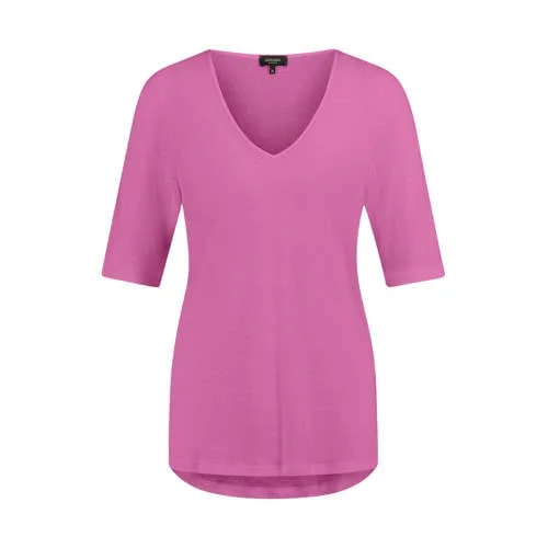 Deze roze dames top met lyocell en linnen van Claudia Sträter geeft je outfit direct een verzorgde en vrouwelijke uitstraling. De effen roze kleur is zacht en makkelijk te combineren, terwijl de V-hals en de driekwart mouwen zorgen voor een open en lichte look. Het materiaal van 70% lyocell en 30% linnen voelt soepel en luchtig aan, ideaal voor het voorjaar en mildere dagen.Verfijnde details voor elke dag Gemaakt van 70% lyocell en 30% linnen, voor een zachte en luchtige touch op de huid Effen roze kleur voor een rustige en stijlvolle basis in je garderobe Driekwart mouwen met rechte mouwset voor een moderne, nette uitstraling V-hals die de halslijn mooi opent zonder te diep te vallen Zonder zakken voor een glad en verfijnd silhouetMakkelijk combineren in jouw garderobeDeze top past goed bij een aangesloten jeans, een elegante pantalon of een rok met hoge taille. Door de driekwart mouwen is de top geschikt voor op kantoor, een etentje of een dag in de stad. Draag er in het voorjaar een lichte blazer overheen en in de zomer gewoon solo.Claudia Sträter: eigentijds en verzorgdClaudia Sträter staat bekend om vrouwelijke collecties met een heldere lijnvoering en aandacht voor pasvorm. De ontwerpen zijn doordacht, met oog voor detail en draagmoment, zodat je met weinig moeite een verzorgde look neerzet. Deze top past naadloos in die visie en vormt een betrouwbare basis voor talloze outfits.Een stijlvolle keuze als je op zoek bent naar een lichte, vrouwelijke top die je vaak en met plezier draagt.