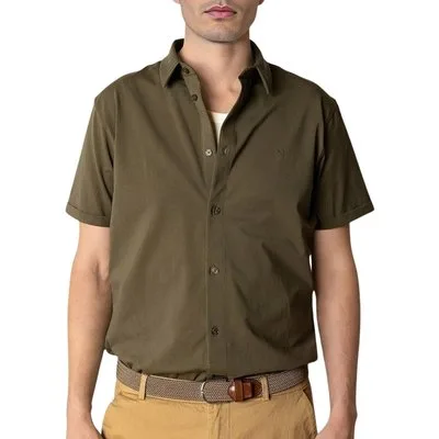 Specificaties: * Pasvorm: regular fit; korte mouwen * Sluiting: knoopsluiting * Kleur: donkergroen * Materiaal: 92% katoen – 8% elastaan * Extra bijzonderheden: cutaway-kraag; zachte jersey-stof