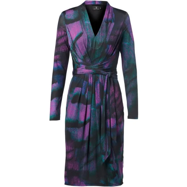 De Clemence print jurk in een zwart-paars multi-print is een prachtig stuk van gedrapeerde jersey stof, voorzien van een sierlijke tulpkraag en lange mouwen. Het abstracte patroon op de jurk heeft een zwarte achtergrond, waarin paarse, groene en een vleugje kobaltblauwe tinten harmonieus samenkomen. De pasvorm van deze jurk is nauwsluitend met een semi-wikkelontwerp. Met een lengte die reikt tot aan de knie en een subtiele aangeknipte strikband in de taille, flatteert de jurk je figuur prachtig en voegt het een vleugje vrouwelijkheid toe. De Clemence print jurk is vervaardigd uit een combinatie van 93% polyester en 7% elastaan. Deze materialen bieden comfortabele rekbaarheid en zorgen voor een optimale pasvorm. Bovendien maakt het hoogwaardige polyester de jurk duurzaam en gemakkelijk te onderhouden. Het gedrapeerde ontwerp met opvallende tulpkraag straalt onmiskenbare elegantie en stijl uit. Dit veelzijdige kledingstuk is geschikt voor verschillende gelegenheden, variërend van formele evenementen tot avondjes uit.Om een chique uitstraling te creëren, kun je de jurk combineren met hakken en stijlvolle accessoires. Als je een meer informele en edgy stijl wilt, kun je ervoor kiezen om de jurk te dragen met laarzen en een leren jasje. De mogelijkheden zijn eindeloos. Een aanbeveling zou zijn om deze jurk te combineren met het Heather jacket in het zwart en zwarte enkellaarsjes voor een tijdloze en elegante uitstraling. Een andere optie is om de jurk te dragen met het lange Chelsea vest in kobaltblauw en hoge zwarte laarzen voor een stoerdere en toch casual look.