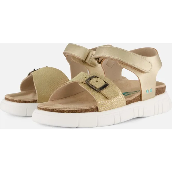 Deze Bunnies JR Bo Beach sandalen voor kinderen stralen dankzij de gouden kleur een vrolijke en zomerse look uit. De sandaal is uitgevoerd in synthetisch materiaal en heeft een zachte suède binnenzool die zorgt voor een prettig draaggevoel tijdens warme dagen. Dankzij de klittenbandsluiting en het verstelbare bandje trek je de sandaal eenvoudig aan en uit en sluit hij goed aan om de voet, terwijl de lichte zool zorgt voor een speelse en comfortabele pasvorm, perfect voor alledaagse avonturen.
