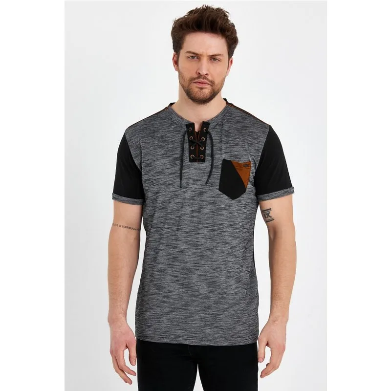 T-shirt heren | Normale pasvorm | Club Ju | 4546-1 Stoer T-shirt heren van het Moda Italia merk Club Ju. Het shirt met korte mouw is voorzien van een hals met koordjes. Tevens is het T-shirt voorzien van kleine details. Het T-shirt heren past goed op je outfit in combinatie met een jeans of een chino. Materiaal: 95% Katoen, 5% Elastan Kleur: Zwart Pasvorm: Normale fit