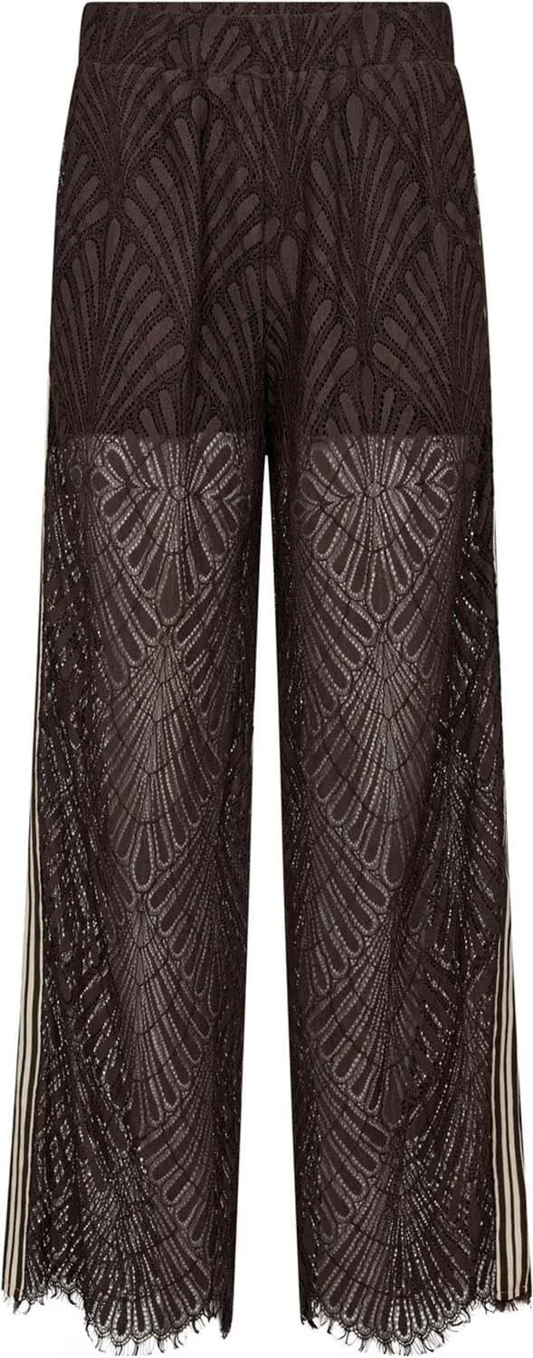 Broek Leti van Co'Couture is een lange broek met wijde pijpen en elastische taille. De zwarte stof heeft een grafisch, kantachtig patroon met transparant effect en geschulpte zoom. Afgewerkt met franjes langs de zijnaden. Combineer met een effen top en hakken voor feest.