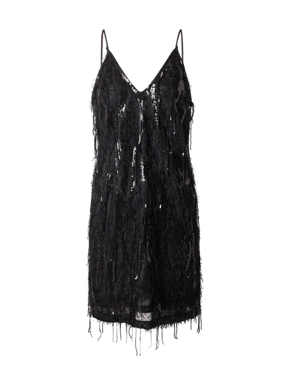 Design: Met onderjurk, Diepe snit/decolleté; Halstype: V-hals; Motief: Effen; Soort bandjes: Spaghettibandjes; Details: Franjes, Pailletten; Extra's: Verstelbare bandjes, Applicaties, Gestructureerd oppervlak; Lengte: Kort/mini; Snit: Recht; Pasvorm: Losse pasvorm; Armlengte: Mouwloos