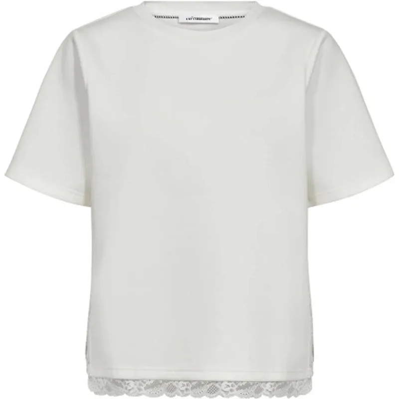 De EviCC Lace Tee van Co'couture is zo’n item dat je er makkelijk even bij pakt, maar toch nét wat extra’s heeft. Dit witte T-shirt oogt clean en minimalistisch, maar verrast met een verfijnde kanten afwerking aan de onderzijde. Het kant piept subtiel onder de zoom vandaan en geeft het shirt een vrouwelijke, elegante twist. De rechte pasvorm en ronde hals zorgen voor een relaxte fit die fijn draagt, terwijl de zachte stof comfortabel aanvoelt op de huid. Daardoor is dit shirt perfect voor elke dag, maar ook ideaal om wat chiquer te stylen. Draag ’m casual op een jeans of combineer met een pantalon of blazer voor een verzorgde, moderne look. Product details: Merk: Co’Couture Style: EviCC Lace Tee Stylecode: 43031 Kleur: wit Pasvorm: recht Hals: ronde hals Detail: kanten afwerking aan de onderzijde Stijl: basic met vrouwelijke touch Materiaal: 55% viscose, 40% polyester, 5% elastaan.