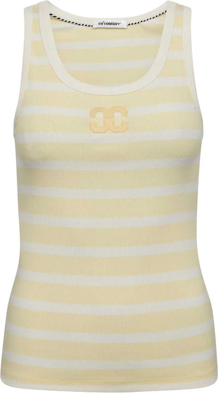 Top Granny, top mouwloos van Co'Couture, heeft een ronde hals, geen mouwen en een strakke pasvorm. Het gestreepte patroon in zachte tinten en de subtiele logobadge op de borst geven een casual, sportieve uitstraling. Fijn te combineren met jeans, rok of short.