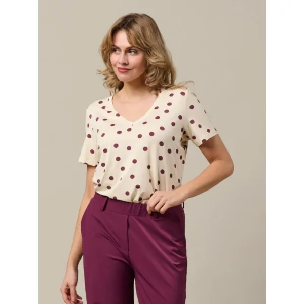 Deze top met V-hals is gemaakt in een mooie Viscose kwaliteit. Materiaal: 96% Viscose 4% Elastaan. Patroon: stippen. Wasvoorschrift: Machinewas max. Fijne was 30 graden Celsius. Niet in droger. Extra details zijn: - V-hals. - Korte mouw. Leuk te dragen met verschillende items van &Co Woman.