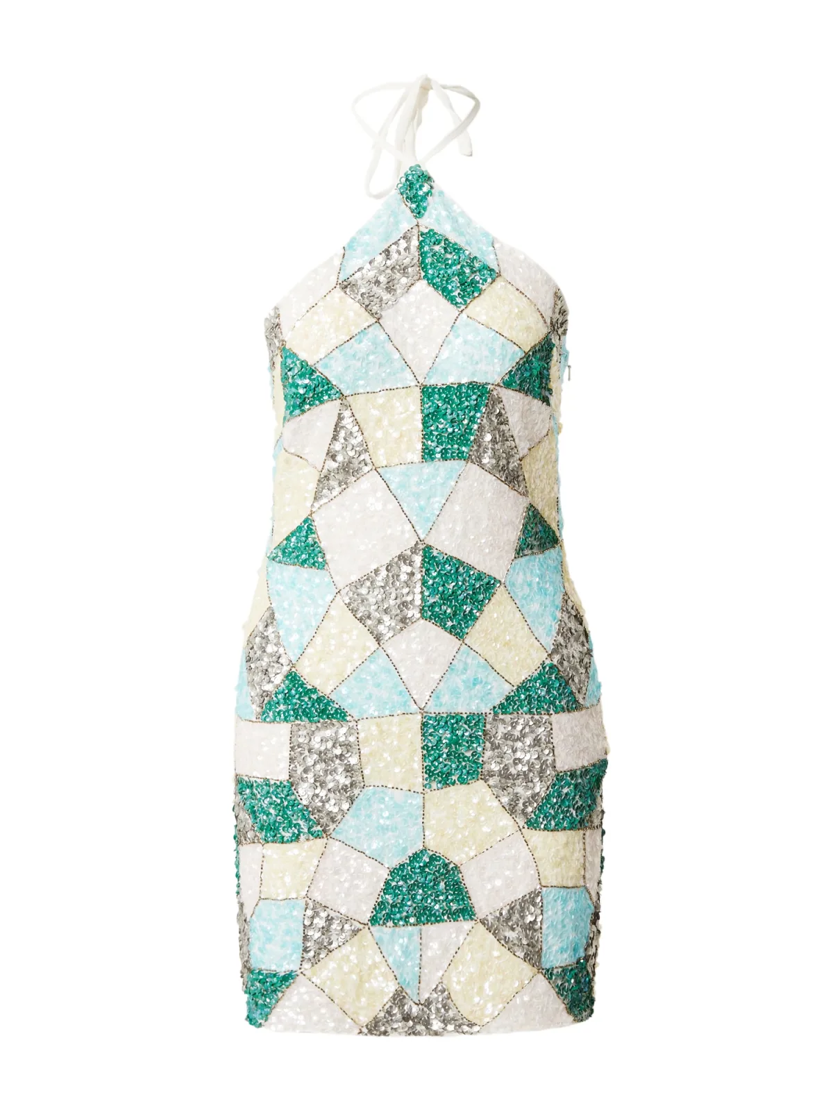 Design: Rechte zoom, Om te knopen/binden; Soort bandjes: Haltermodel; Details: Pailletten; Extra's: Glanzend, All-over patroon; Lengte: Kort/mini; Pasvorm: Slanke pasvorm; Armlengte: Mouwloos