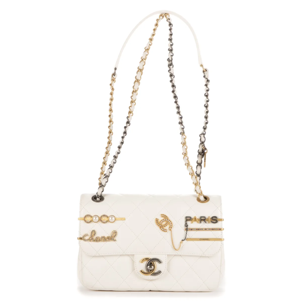 Chanel Tassen Coco Clips Rhinestones Single Flap Schoudertas in de Wit Kalfsleer in de Gunmetal/Goud hardware. Het product is in In Perfecte Staat (AA). Afmetingen: 21x14x7 cm Inclusief accessoires: Metal Plate Code, Dustbag, Box BrandCo Paris vindt zeldzame artikelen in de beste staat voor ongelooflijke prijzen. Het is de moeite waard om geduldig te zijn! Koop met vertrouwen: alle artikelen van BrandCo Paris worden zorgvuldig geselecteerd en geverifieerd door ons team van experts. Alle artikelen worden geleverd met een certificaat van echtheid en verpakt door BrandCo Paris. Classificatietabel voor de conditie van het artikel: N (als nieuw) AA (perfecte staat) A (uitstekende staat) AB (zeer goede staat) B (goede/redelijke staat)