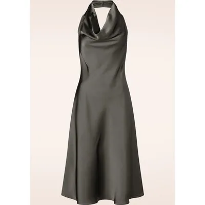 “As smooth as chocolate, as timeless as satin!” Deze midi halter jurk heeft een subtiele waterval hals en is uitgevoerd in een non-stretchy bruingrijze stof met de look and feel van luxe satijn, die heerlijk draagt! * Midi jurk * Halterstijl * Waterval hals * Rugpand met elastiek * Geen rits of knopen * Valt net op de kuit bij een lengte van 1,70 m