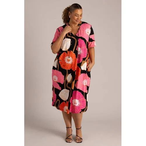 Deze dames midi jurk met bloemenprint van Colletta brengt kleur in je dagelijkse garderobe. De roze basis met zwarte en oranje accenten zorgt voor een frisse, zomerse uitstraling, terwijl de all over bloemenprint meteen in het oog springt. De V-hals met veterdetail geeft net wat extra karakter en maakt de halslijn eenvoudig aan te passen aan jouw voorkeur.Details die je elke dag wilt dragen Midi lengte, valt rond de knie voor een fijne balans tussen luchtig en bedekt Korte, rechte mouwen die veel bewegingsvrijheid geven V-hals met veter, waarmee je zelf de opening kunt bepalen Zachte, soepele stof met 5% elastaan voor lichte stretch en een comfortabele pasvorm All over bloemenprint in roze, zwart en oranje voor een levendige look Geen zakken, waardoor de jurk mooi glad langs het lichaam valt Wasbaar op 30 graden, praktisch voor regelmatig dragen Onderdeel van het grote maten assortiment, ontworpen met aandacht voor pasvormZomerse jurk voor dagelijks gebruikDeze jurk uit de 'Daily' collectie is ideaal voor warme dagen. Draag hem met sandalen of sneakers voor een ontspannen look. De middel lange lengte en de soepele stof maken de jurk geschikt voor werk, een lunchafspraak of een dagje stad.Colletta: mode voor elke dagColletta richt zich op draagbare mode die goed aansluit bij het dagelijks leven. De collectie combineert moderne prints met comfortabele modellen, zodat je er verzorgd uitziet en je toch vrij kunt bewegen. Met deze jurk haal je een betrouwbaar kledingstuk in huis waar je vaak naar zult grijpen.Een kleurrijke keuze voor ontspannen, zomerse dagen.