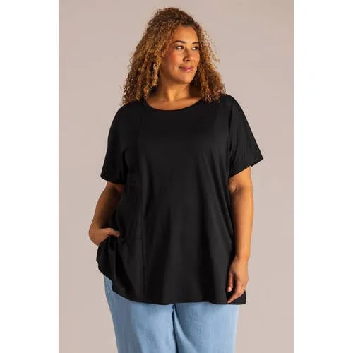Voor elke dag van de week een betrouwbare basic in je kast, dat is dit zwarte dames T-shirt van Colletta. Het effen shirt uit de 'Daily' collectie heeft een middellange lengte, korte rechte mouwen en een ronde hals. Ideaal als losse top op een broek of rok, maar ook heel geschikt om onder een vest of blazer te dragen.Comfortabele pasvorm voor elke dag Gemaakt van 64% viscose, 28% nylon en 8% elastaan voor een soepele en zachte touch Effen zwarte kleur, makkelijk te combineren met de rest van je garderobe Middellange lengte die mooi over de heupen valt Korte mouwen met rechte snit voor een rustig silhouet Ronde hals die niet te hoog en niet te diep is Geschikt voor grote maten, met aandacht voor draagcomfort Wasbaar op 30 graden, handig in het dagelijks onderhoudGeschikt voor werk, thuis en onderwegDit T-shirt past net zo goed bij een nette broek als bij een relaxte jeans. In de lente draag je het solo, op frissere dagen combineer je het makkelijk met een vest of jasje. De soepele stof beweegt met je mee, zodat je je de hele dag vrij kunt bewegen.Colletta: mode voor elke dagColletta ontwerpt kleding die prettig draagt en goed past in je dagelijkse leven. Met toegankelijke modellen, fijne materialen en een doordachte pasvorm, ook in grote maten, biedt Colletta een garderobe waar je vaak naar grijpt.Een veelzijdig T-shirt dat goed past in je dagelijkse outfits.