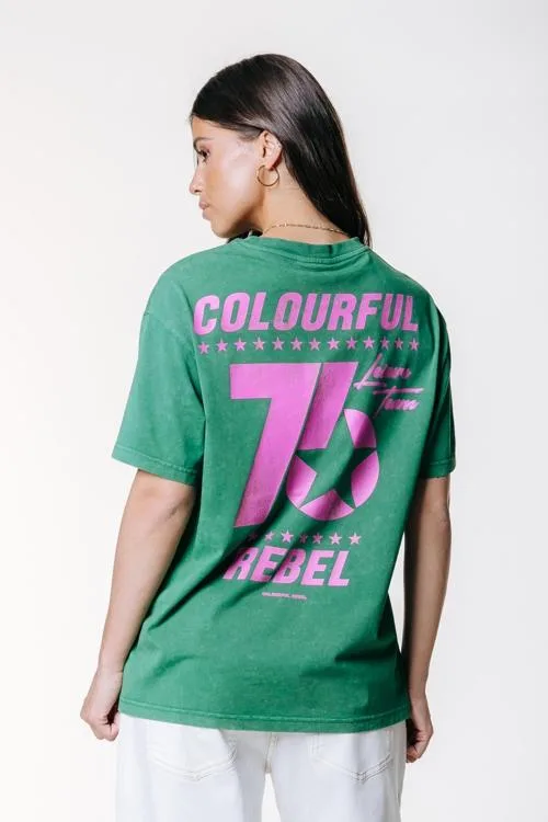 Dit Dames T-Shirt is uitgevoerd in comfortabele jerseykwaliteit met een klassieke ronde hals en ribboord, zonder sluiting. Het heeft korte mouwen en een relaxte pasvorm. Op de borst staat een subtiel logo, achterop een contrasterende fuchsia print met de woorden COLOURFUL REBEL en het getal 75, omlijst door sterren. De rechte zoom houdt het silhouet clean. Een herkenbaar kledingstuk van Colourful Rebel binnen Dames, T-Shirts & Tops dat snel favoriet wordt.